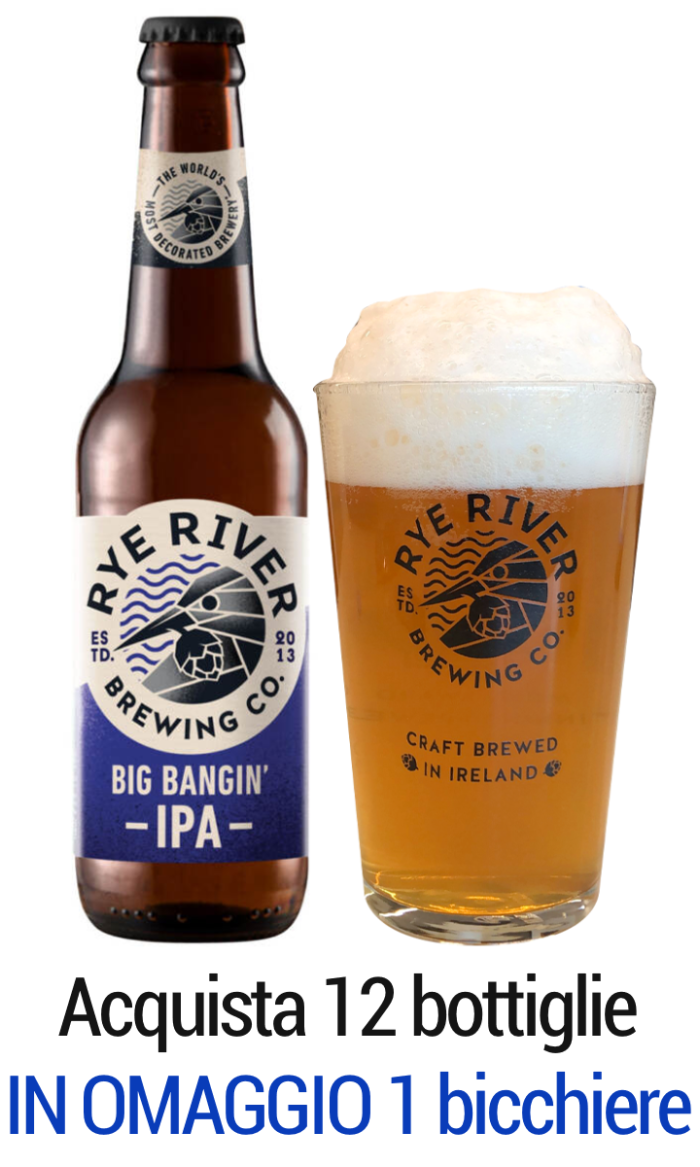 Birra artigianale ispirata allo stile IPA della costa occidentale degli Stati Uniti, la Rye River Big Bangin' IPA è prodotta utilizzando solo il migliore malto di orzo Maris Otter ed è fortemente luppolata grazie alla varietà di luppoli aromatici tropicali utilizzati. Medaglia d’Oro nel 2021 e Argento 2022 ai World Beer Awards.