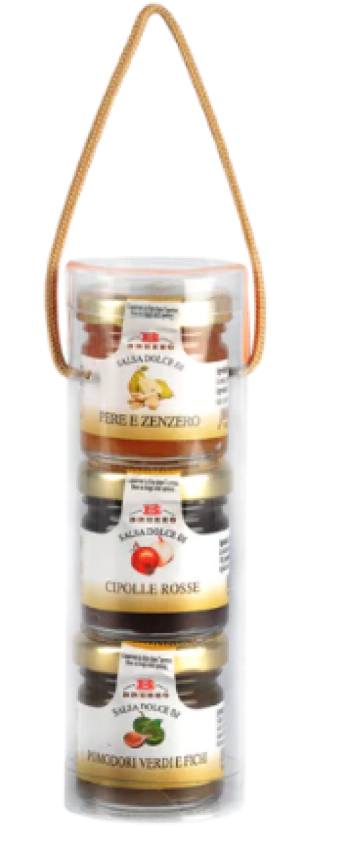 Note: Astuccio in cartone contenente un tris di Salse per formaggi. Assortimento: Salsa di Cipolle Rosse, Salsa di Pere e Zenzero, Salsa di Mele e Noci.